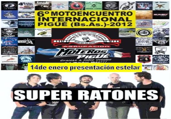 6 motoencuentro internacional en pigue bs.as. 13,14 y 15 de enero 2012. organizado por la agrupacion moteros pigue. bandas de nivel nacional (super ratones) y bandas locales en vivo. show acrobtico de internacional (paulo silva). recepcion con cerveza y sandwichs de miga. cantina las 24 hs. el clsico torneos de pulseadas. para el sabado: cena para moteros (carne asada, ensalada, chorizo y vajilla) desayuno sabado y domingo( cafe con pasteles) pilcheros y artesanos. baos con ducha caliente las 24hs. menciones especiales. predio totalmente asfaltado: 60 hectareas arboladas, parrillas, iluminacin, electricidad y pileta de natacion. si venis de a dos pagas uno y medio. ya sabes como te atendemos en pigue y si no comprobalo y volveras