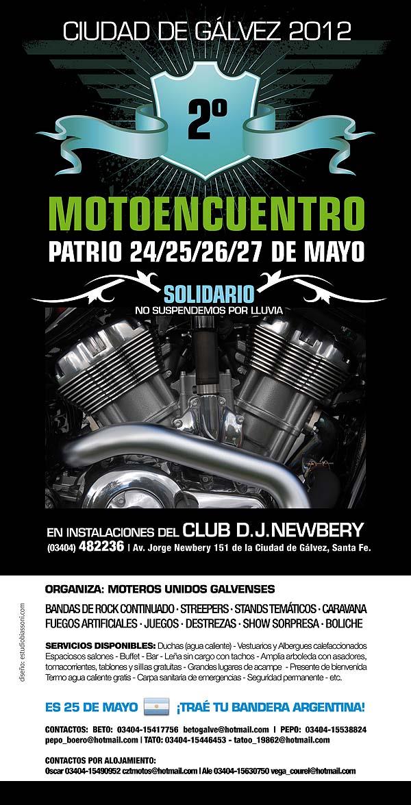 motoencuentro solidario y patrio - actuarn: legendarios 70 - suasnabar - serie 2 - galvez music band - big roger band y otros - la presencia de nelly iglesias - la presencia de palito rios y su moto !!!! - estarn las cmaras de motoviajeros - animacion el negro brian - museo de motos antiguas (entrada a beneficio escuela sarmiento) - instalaciones del club deportivo jorge newbery muy buenas, con amplios salones, frondosa arboleda, asadores, grandes lugares de acampe, tomacorrientes, albergues en el mismo club calefaccionados gratis(traer ropa de cama), duchas agua caliente, lea gratis con tachos, tablones y sillas a disposicin, termo general agua caliente, carpa sanitaria, seguridad permanente, presente de bienvenida, etc - no se suspende por lluvia - muchas gracias a todos los que nos alientan y nos dan una mano !! - trae tu bandera argentina, es 25 de mayo !!!! haremos la caravana celeste y blanca por la ciudad.