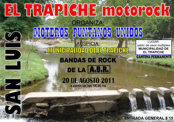 comienza el dia sabado 20 de agosto a las 14:00 hs. - recital de bandas de rock en vivo en el sum de la municipalidad del trapiche - juegos y destrezas - caravana - show en vivo, bandas que articipan: la yugular rock,la piedra. mundano, maldito esclavo, locomotion, power machine, steel flame, boulevar,escararriba, fierro solo rock. ---------mucha onda y rock and roll, es un evento previo realizado por los organizadores de la ii megaconcentracion 11,12 y13 de noviembre el el circuito internacional de lago potrero de los funes (boxes) se rifa un motor 0k. marca sumo . valor del numero $ 2,50.