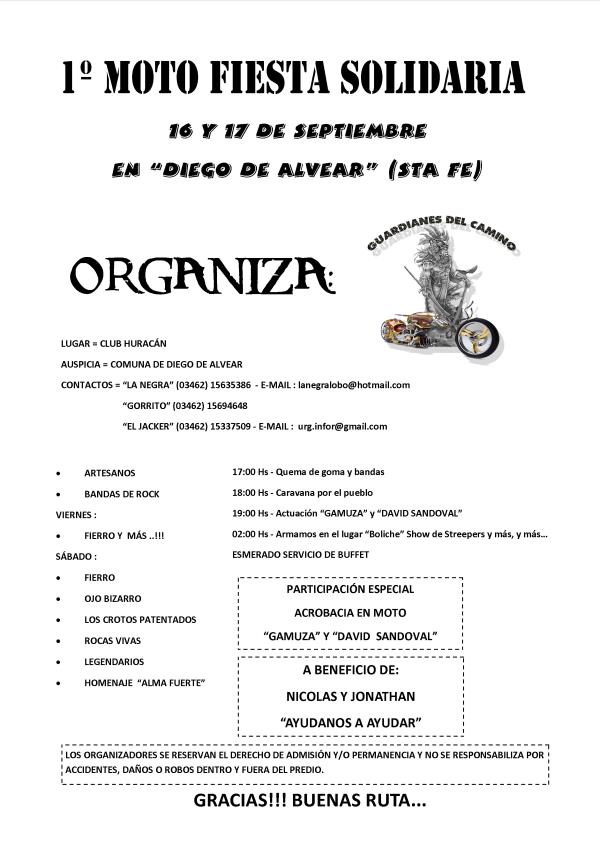 una fiesta motera, solidaria, para nico y jona ( con tratamiento de quimio y rayo ), lugar es un pueblo llamado diego de alvear (sta. fe), de junin 80 kms por la ruta 7.