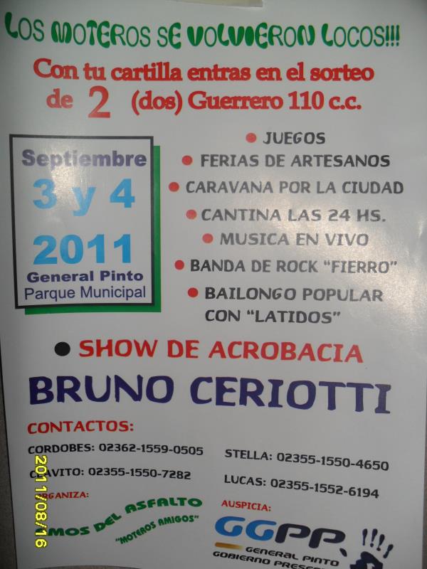 sorteamos 2 guerrero 110cc con el numero de tu cartilla , estara bruno cerioti como asi tambie fierro aca viene lo diferente cerramos el encuentro el dia sabado con un baile popular despue tendremos sorteos, carvana por la ciudad, juegos, destrezas, entrega de menciones, gran!!!!!!!!!expo de motos antiguas!!!!!!!!!!!!!!!!!!!!!!!!!!!!!