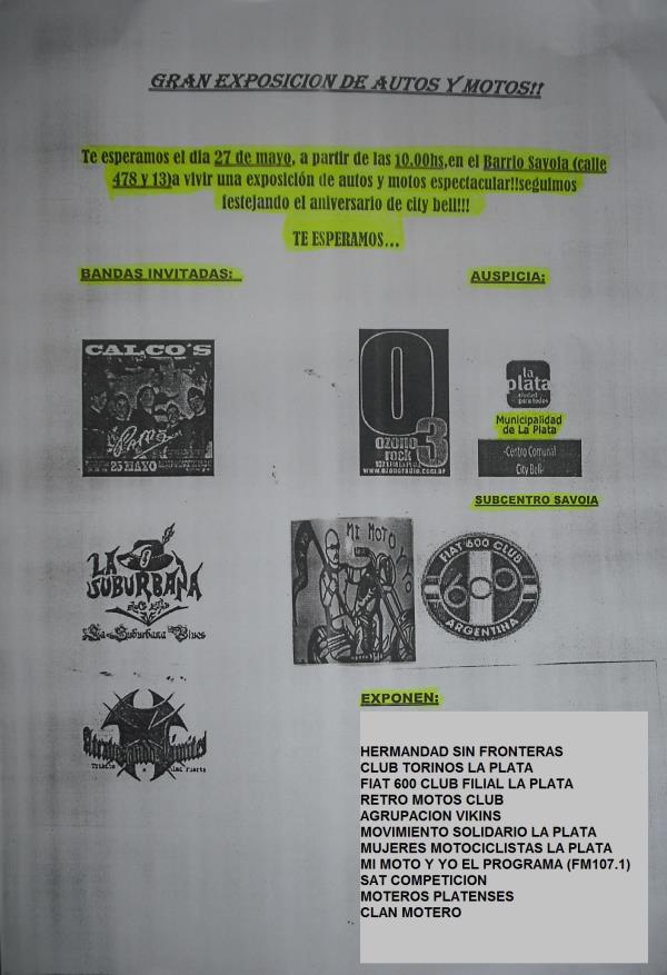 gran exposicion de autos y motos solidaria !!!te esperamos el dia 27 de mayo a partir de las 10 hs. en el barrio savoia 478 y 13 para vivir una exposicion de autos y motos espectacular!!! seguimos festejando el aniversario de city bell, te esperamos, entrada libre y gratuita, solamente te pedimos un alimentos no perecederos-libros-juguetes o lo que consideres que pueda ser util para quienes mas lo necesitan, los juguetes donados seran destinados para entragar el dia del nio, el resto sera donado a entidades de la zona.los integrantes de fiat 600 club filial la plata, brindaran una chocolateada solidaria, pedimos a todos aquellos que puedan donar leche y/chocolate y galletitas ( les serviremos chocolate caliente caliente a todos), trae tu taza una olla, lo que sientas que sea util.bandas en vivo: atravesando limites (tributo a alma fuerte)la suburbana blues (temas propios)calcos blues (tributo a pappo)auspicia este evento: municipalidad de la plata centro comunal city bell (subcentro savoia)colaboran con este evento:-hermandad sin fronteras argentina-club torinos la plata-fiat 600 club filial la plata-retro motos club-agrupacion vikins-movimiento solidario la plata-mujeres motociclistas la plata-mi moto y yo el programa (fm ozono 107.1)-sat competicion-moteros platenses-clan moteropor cualquier informacion comunicarse a:cesar (mi moto y yo) 0221-155392209 id:635*5302german (mi moto y yo) 0221-154118475 id: 649*1549