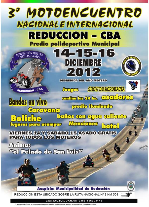 viernes 14/12/2012 estaremos recibiendo a los primeros amigos moteros para compartir los primeros asaditos de camaraderia,el sonido a full,las bandas sonando desde temprano, la conduccion del evento estara a cargo del pelado de san luis con la mejor onda que lo caracteriza siempre. por la noche tendremos una pollada gratis para todos los moteros y luego podran,los que quieran ir al boliche....el sabado temprano,recepcion de los moteros,bandas, stand de ventas, cantina, asado, juegos, destrezas en moto, menciones,caravana,show de acrobacias en moto,y por la noche el gran asado gratis para todos con lechones a las llamas(traer plato y cubiertos).bandas tocando, entrega de recordatorios,premios y menciones, gran brindis entre todos por la despedida del ao motero y al boliche!!! o bien armaremos una joda en el predio.!!traer platos y cubiertos !!!
