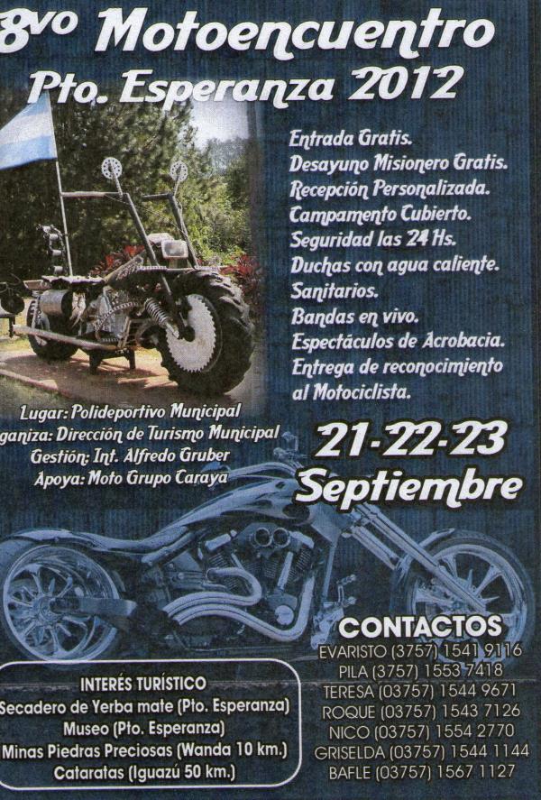 reunion motera, que va creciendo ao a ao, gracias a los amigos que visitan y conocen la calidez de la ciudad en medio de la naturaleza misionera, la atencion personalizada a lo motoviajeros nos caracteriza. como asi tambien el reconocimiento a cada agrupacion que consiste en un souvenir de recuerdo.