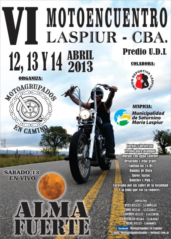 amigos ya empezo la cuenta regresiva y les comentamos que el dia viernes van a estar tocando 6 bandas , tendremos boliche gratis para todos los motociclista que lleguen , el sabado tendremos juegos , regalos , shows de remeras mojadas , show de acrobacia , entrega de recordatorios y menciones buscando la mejor fiesta para vos con un cierre a todo almafuerte , los esperamos , buena ruta motoagrupados en camino .