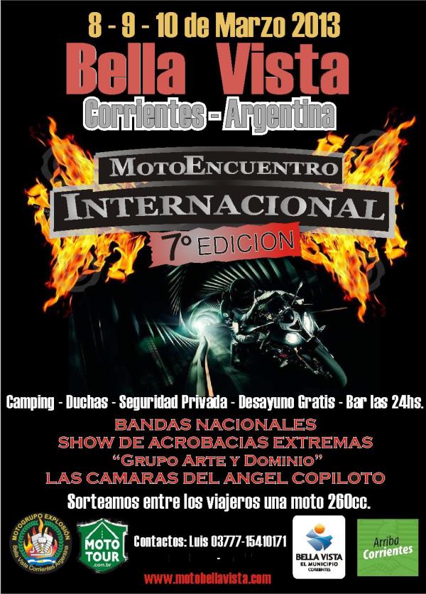 prximamente en el 2013...todos estan invitados a visitar la hermosa ciudad de bella vista,corrientes,con su preciosa costanera,gente con la mejor onda y el motoencuentro ms grande de corrientes!!si te perdiste la edicin anterior no te podes perder la 7 edicin!!los estaremos esperando.