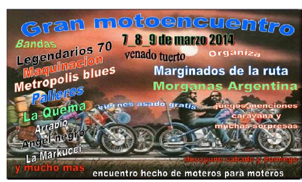 es el primer encuentro organizado por morganas y marginados en venado tuerto 7_8_9 de marzo del 2014 . nuestro encuentro estaba programado en amenabar y por razones politicas ajenas a nuestros grupos no se puede hacer pero marginados y morganas somos de la ciudad de venado tuerto y zona , en venado se iniciaron dichos grupos por eso nos pone muy contentos poderlo hacer en nuestra ciudad buenas rutas los esperamos