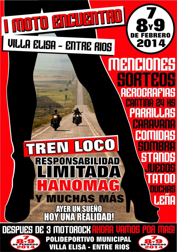 toda la info que necesitas en https://www.facebook.com/motorock.villaelisa (no se permiten tiros con los escapes, uso de casco obligatorio)