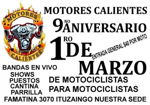 9 fiesta aniversario motores calientes, te esperamos para compartir otro momento unico entre amigos. bandas en vivo, cantina, shows, puestos, parrillas,forastero: 655*5417 / tuerca: 746*4773
