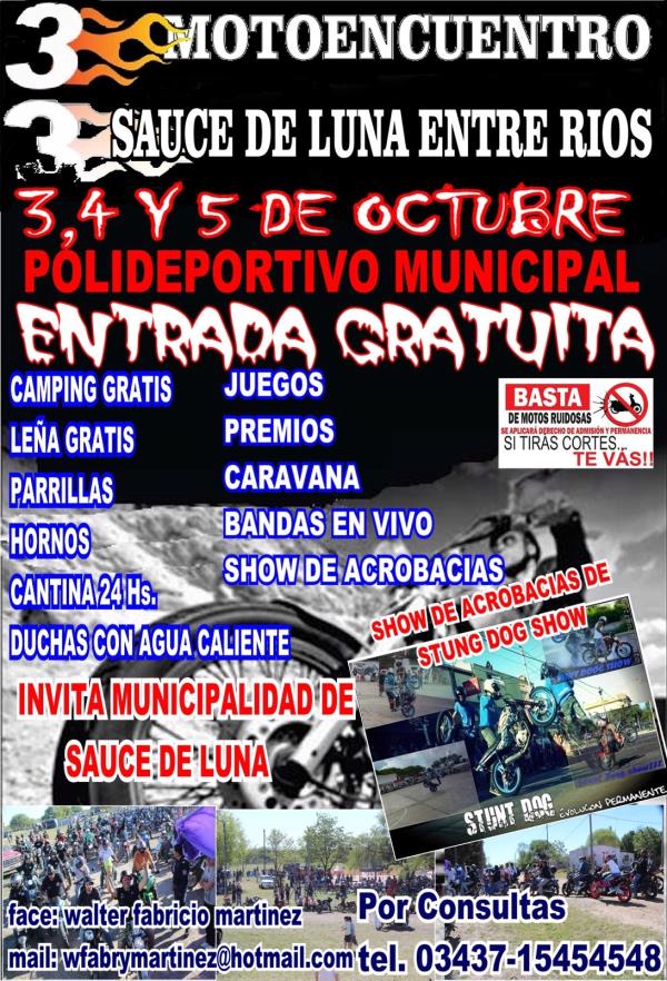 el motoencuentro comenzara el da viernes en el polideportivo municipal por la noche habr bandas en vivo, el da sbado se realizaran juegos y competencias. la caravana por la ciudad. show de acrobacias. menciones. domingo desconsentracion.