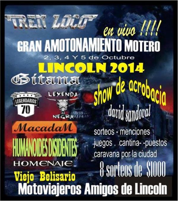 a puro rock roll y haevy metal con tren loco, legendarios 70, macadam, gitana, homenaje(tributo almafuerte),humanoides disidentes,leyenda negra.ocho sorteos de $1000 en efectivo,show de acrobacias con david sandoval, duchas, baos agua caliente. atc