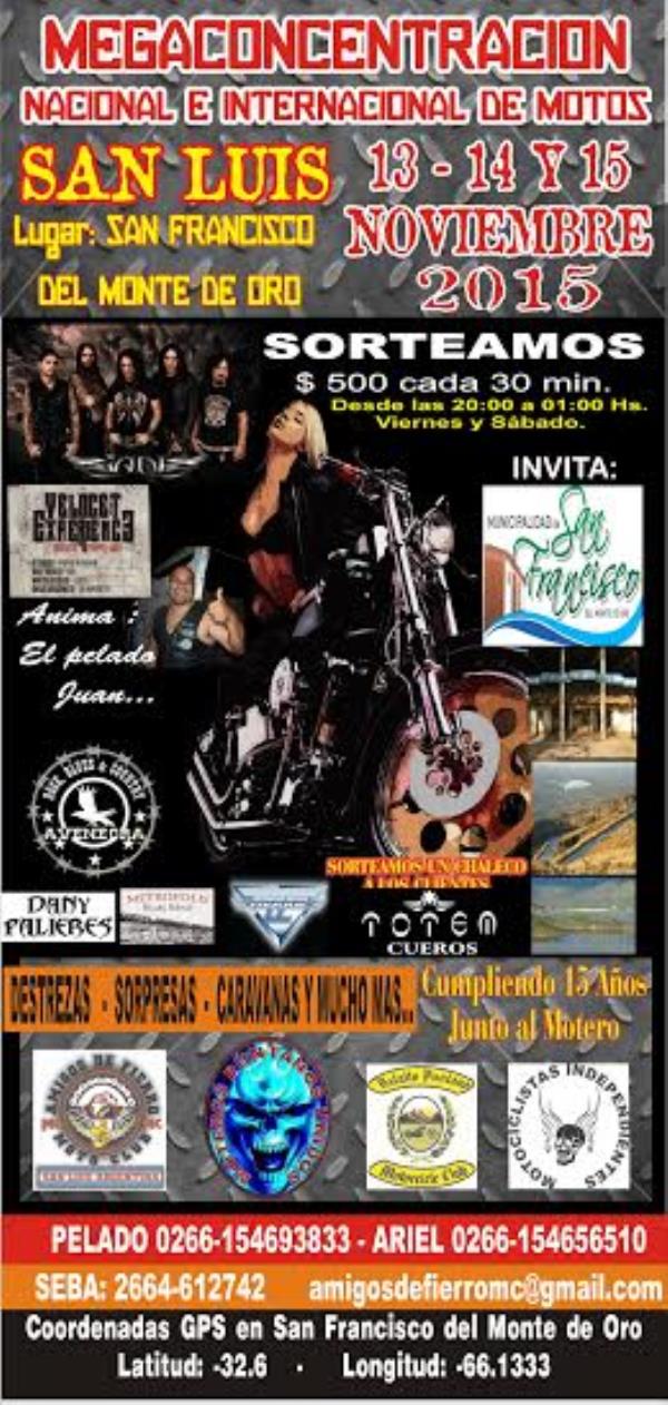 se sortea un chaleco de cuero para los clientes de cueros totem........... recepcion: empanadas de copetin- canapes y dulces - cafe y gaseosas (gratis) jueves: pollo asado gratis (cena) viernes: carne a la masa gratis (cena). desayuno gratis. caravanas con refrigerio gratis. acampe incluido.baños limpios y duchas con agua caliente. seis bandas nacionales y seis bandas provinciales. la mejor cantina atendida por el bar del rock en san luis:panacea bar...y mucho mas.....$150 por persona.. !!!!!!! aaaaahhhhhh.........rifamos $500 pesos cada 1/2 hora desde la 20:00 a 01:00 hs. viernes y sabado... reprogramamos las bandas: no viene o[conors y tano romano (no cumplieron contrato) por tener fecha con malon, contratamos a ian (ex-rata blanca-)...velocet experienc 3 (tributo pappo-riff) dany palieres - metropolis blus band - ave negra - martillo - .....y muchas mas........ , .... la mega....un clasico del motociclismo argentino...... !!!!!!!!