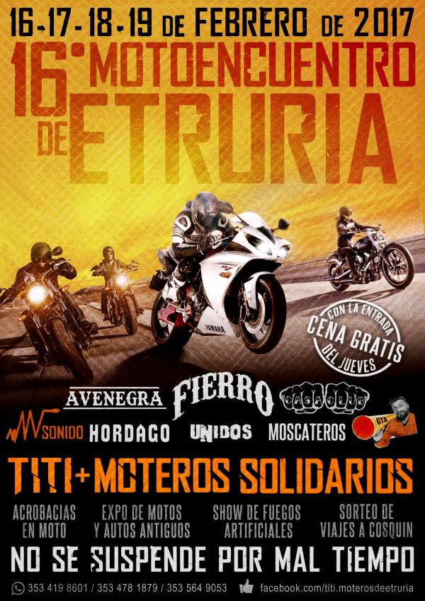 llega el 16º motoencuentro nacional e internacional de etruria, organizado por la agrupación titi + moteros solidarios el cual año tras año se perfila como el encuentro donde se combinan muchas sensaciones, un encuentro único por su calidad de bienvenida, un encuentro para disfrutarlo en familia.