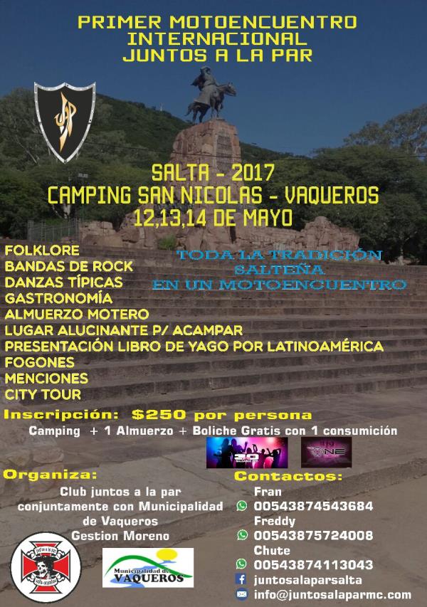 salta un lugar geografico exelente un lugar de tierra gaucha tradiciones y maravillozos paisajes una plaza unica en el norte del pais.acercate conocenos y disfruta de este evento que te dejara recuerdos inolvidables vivencias con amigos y lo mejor del motociclismo internacional te esperamos tenes una opcion mas eleginos y pasala genial.