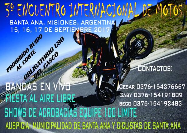 que no te lo cuenten vivilo con nosotros vamos a disfrutar del 3º encuentro internacional de motos a realizarse los dias 15, 16, y 17 de septiembre dia viernes bandas en vivo ciencia ficcion, alta tension y pueblo chico sabado visitas guiadas a parque tematico la cruz show de acrobacias a cargo de 100 limite de brasil