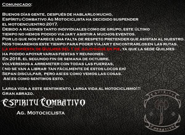 buenos días gente, después de hablarlo mucho, espíritu combativo ag motociclista ha decidido suspender el motoencuentro 2017.