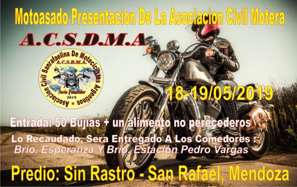 nuestro primer motoasado, en el predio de sin rastro, presentacin en sociedad, de la nueve asociacin motera de san rafael, mendoza. a.c.s.d.m.a.( asociacin sanrafaelina de moteros argentinos), tambin se presentara la banda, tercera generacin, creadas por los hermanos de espritu de venganza. los moteros que quieras ingresar al predio el da 18, se podr hacer despus de las 18 hs.
