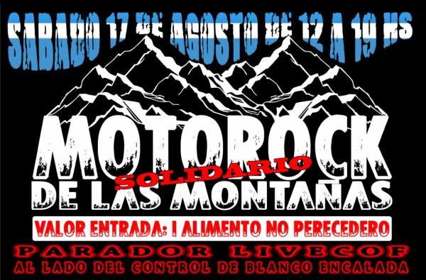 motorock de las montaas. solidario. bandas en vivo, motos, comidas regionales, barras de bebidas, stam de indumentarias, tattoos, cerveza tirada, foodtruck, regalos y ms!!!! en un paisaje grandioso, rodeado de majestuosas montaas mendocinas. sers muy bienvenido con toda la buena onda que nos caracteriza. te esperamos desde las 12hs hasta las 19hs. no te lo pods perder!!!! invita mum mendoza.