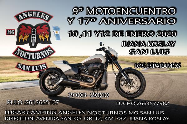 estamos realizando nuestro 9 motoencuentro y festejando 17 aniversario ya 17 aos rodando x nuestro pais los eperamos para juntos realisemos esta gran fiesta el predio esta abierto apartir de 28 de diciembre abra servicio de cantina y buffet muy economico ,bandas ,menciones ,sorteos ,juegos ,y muchas mas los esperamos con la atenccion de siempre