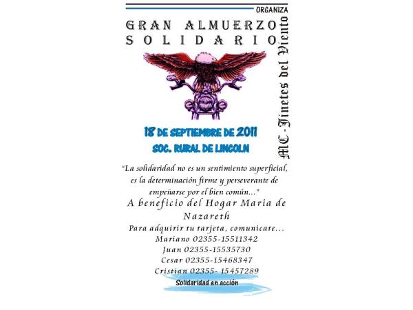 gran almuerzo solidario a beneficio del hogar mara de nazaret. los invitamos a formar parte de esta reunin. el propsito, es juntar dinero para poder festejarle el cumpleaos de 15 a mara del rosario, que es pupila del citado hogar.la tarjeta del almuerzo tendr valor de $ 50,00.- con la cual podr acceder a una entrada, una bebida, asado (libre), postre y caf. con el nmero de la misma, podr participar de sorteos.habr shows en vivo, premios, msica, y mucha buena onda.reserven la tarjeta con anticipacin, hay cupo limitado.entre todos le vamos a cumplir el sueo a mara del rosario... los esperamos!!! - m.c. jinetes del viento