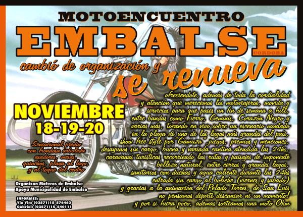 el evento cuenta con nueva organizacion lo cual es muy bueno destacar a cargo de yin yin ,jojart,ygerman..... bueno se trata de un encuentro de moteros lo cual la idea es pasarla bien entre amigos y comer unos asaditos escuchar a buenas bandas y difrutar del lugar q ya muchos lo conocen y los q no les va a encantar