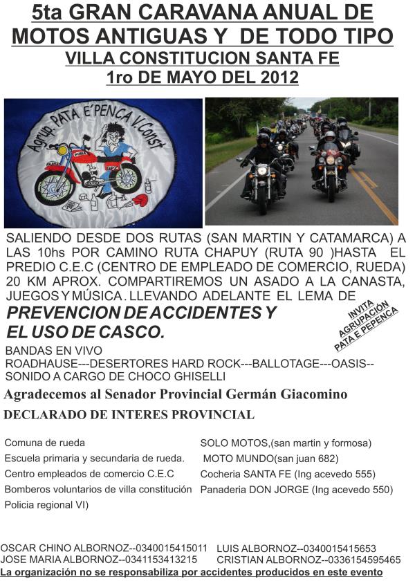 realizamos la 5ta caravana anual de motos en villa constitucion ,nos juntamos en predio dos rutas a las 10 am calle san martin y catamarca en villa constitucion . salimos en caravana hacia la localidad de rueda al camping centro de empleado de comercio. tendremos el predio para nosotros donde contamos con parrillero para que realizen sus asados de agrupacion ,baos ,cantina y bandas de musicas.si no llegas a la caravana llegate directamente al camping centro empleado de comercio en rueda.