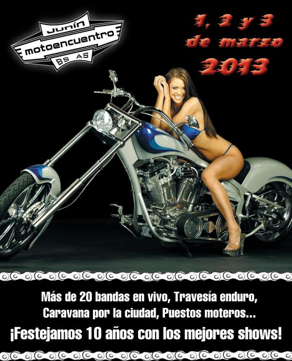 festejamos los 10 aos de motoencuentros en nuestra ciudad con las mejores bandas de rock, una travesia enduro increible, exposicion de motos, puestos moteros, streep-tees, lucha en el barro, remeras mojadas, pantallas gigantes, fuegos artificiales, etc. etc. etc.
