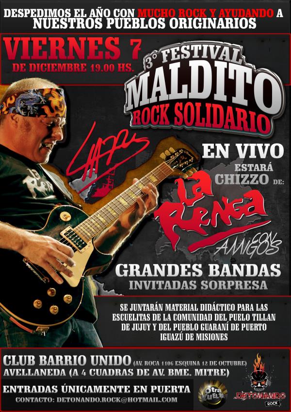 viernes 7 de diciembre - 19.00 hs, los esperamos a todos para colaborar: 3 festival maldito rock solidario.estar presente chizzo de la renga y amigos junto a grandes bandas sorpresas: lovorne con luciano napolitano, mad, cola de pato, el ave, alejandro medina, ely de gardelitos, la potoca, maldito veneno, y muchas ms. gran zapada final.se estar juntando material didctico para las escuelitas de las comunidades de jujuy y misiones.cerramos el ao con mucho rock y colaborando con nuestros pueblos originarios.entradas solamente en puerta a $50.-los esperamos y agradecemos su difusin.
