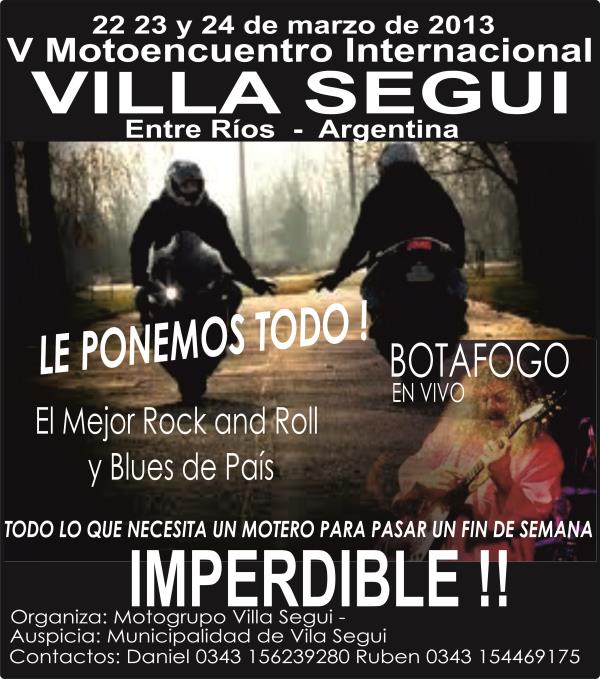 con la entrada sorteamos una moto 0km, las motos mas lindas, las chicas bonitas, la cerveza barata y el mejor rock and roll y blues de sudamrica. botafogo - responsabilidad limitada - mxima tensin - buey - buenayunta - attitude for destruction - fosil - el espejo - la rasposa blues - el torque y mas... como siempre, le ponemos todo, para que valga la pena cada km recorrido a villa segui.