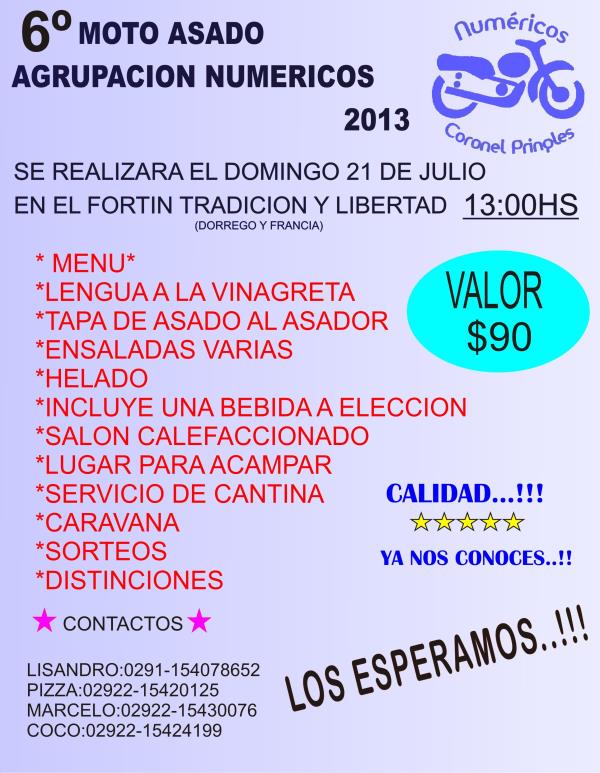 6 moto asado organizado por agrupacion numericos.ya un clasico de todos los aos....no te lo podes perder.....y como siempre fetejaremos juntos el dia del amigo...!!!!---almuerzo---* menu ** lengua a la vinagreta* tapa de asado con ensaladas varias* helado* incluye una bebida a eleccion*salon calefaccionado* valor de la tarjeta a confirmar- lugar para acampar--servicio de cantina--caravana--sorteos--distinciones--sorpresas-