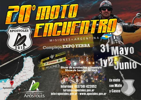 el tipico encuentro de motociclistas en nuestra ciudad.-este ao el evento estara dividido por sectores de distintas cilindradas, y habra mayor seguridad policialcronograma motoencuentroviernes 31 de mayo: 8 hs: desayuno misionero-- quincho predio expo yerba. 8:30 hs: inicio de inscripciones-- predio expo yerba. 14:30 hs: visita guiada al establecimiento yerbatero playadito, salida desde el predio expo yerba. 19 hs: show de motos (freestyle team navarro) -- predio expo yerba. 21:00 hs: bandas soporte en vivo, show tche minino. 22:30 (caso cerrado y revolver beatles band- bs. as.)-- predio expo yerbasbado 1 de junio: 8 hs desayuno misionero--quincho expo yerba. 9 hs: visita guiada a establecimientos yerbateros, salida desde el predio expo yerba. 8:30 hs: inicio de inscripciones-- predio expo yerba. 11 hs: visitas guiadas a la cooperativa yerbateras, museos. 17 hs: show de motos (freestyle - team navarro)-- predio expo yerba. 19 hs: eleccin reina moto encuentro-- predio expo yerba. 20:30 caravana por la ciudad--salida desde predio expo yerba. 21:30 entrega de distinciones-- predio expo yerba. 22:30 hs: bandas en vivo (locales) y show caso cerrado y revolver beatles band- bs. as.-- predio expo yerba.domingo 2 de junio: 8 hs: desayuno misionero10hs despedida.