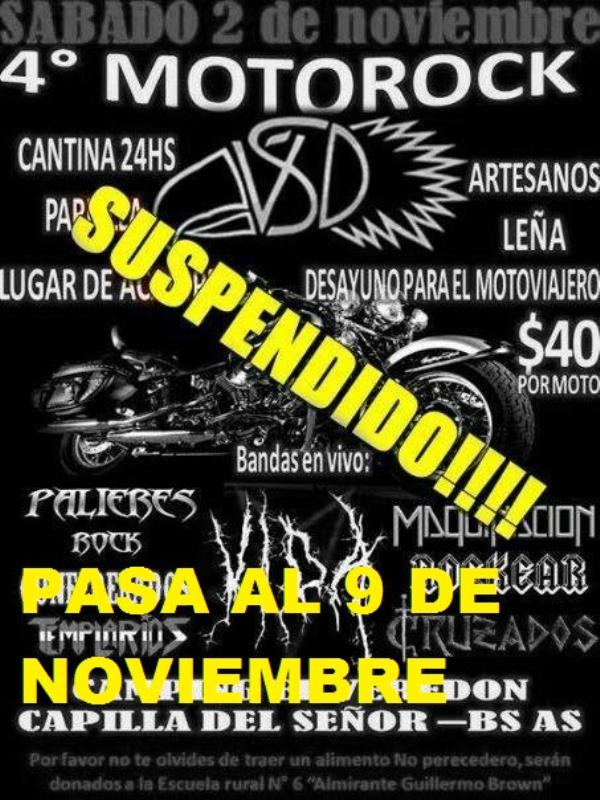 atencin amigos!!!!hola amigos la agrupacin vsd les quera comunicar que debido al temporal nos vemos obligados a suspender el 4 motorock, que estaba programado para este finde 2 de noviembre, corremos la fecha para el otro finde 9 de noviembre en el mismo predio camping el veredn.. ya estaba todo listo, tenamos todo comprado para recibirlos como se lo merecen, espero que sepan entender gracias y aguanten una semanita mas..por favor ayuden a difundir las notificaciones, muchas gracias de parte de toda la agrupacin vsd