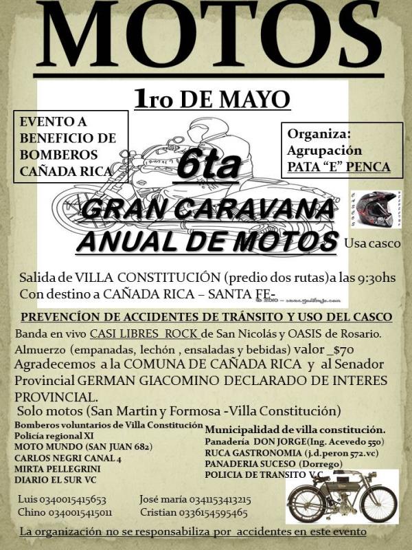 realizamos la 6ta caravana anual de motos en villa constitucion ,nos juntamos en predio dos rutas a las 9:30am calle san martin y catamarca en villa constitucion . salimos en caravana hacia la localidad de caada rica unos 45 km por ruta 90. al medio dia almuerzo y por la tarde bandas de rock. si no llegas a la caravana llegate directamente al pueblo .