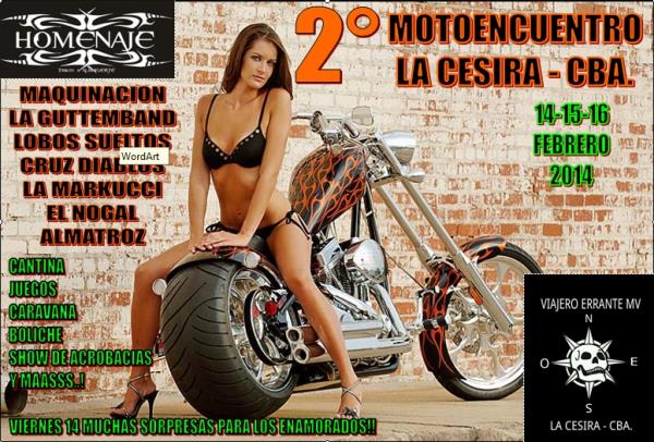 nuevamente la cesira sera la capital motera del sur de cordobalos esperamos con las mejores bandas juegos shows y todo lo que le interesa al moteroo.bandas: homenaje, maquinacion, laguttemband, lobos sueltos, cruz diablos, markucci, almatroz y mas