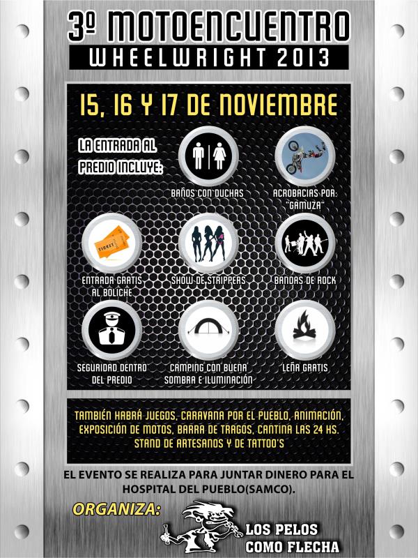 el evento se realiza para juntar dinero para el hospital del pueblo(samco), el evento lo realiza la agrupacin de motos los pelos como flecha.el predio se reserva el derecho de admision y permanencia.los organizadores no se hacen cargo por pedida o extravios dentro del predio, actividades: juegos, caravana por el pueblo, animacion, acrobacias en moto por gamuza bandas, strippers, exposicin de motos, la entrada al predio incluye entrada al boliche, barra de tragos, lea gratis, baos con agua caliente, zona de camping con buena sombra y iluminacin, seguridad en el previo, stan de artesanos, cantina las 24 hrs y bandas con mucho rock and roll!!!!!!!!!!!!!!!!!!!