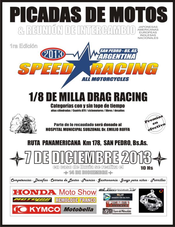 picadas de motoslos invitamos el sabado 7 de diciembre a nuestro primer evento en el picodromo de san pedro, bs.a.desarrollaremos:* velocidad en 1/8 de milla (202mts)* carrera de lentos * encuentro de intercambio. estan todos invitados. los esperamos!