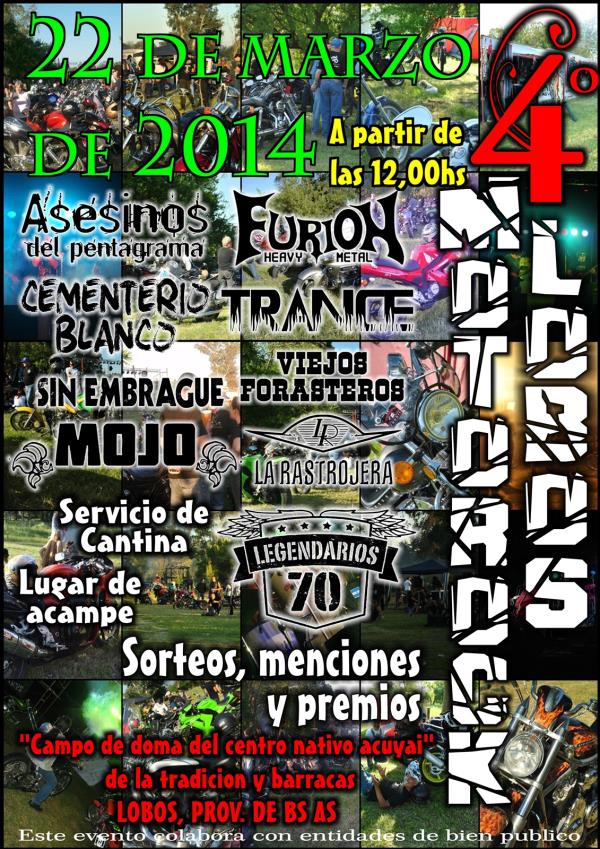 bandas de rock durante todo el dia: legendarios 70, asesinos del pentagrama, furion, cementerio blanco, trance, sin embrague, viejos forasteros, mojo y la rastrojera.lugar de acampe, buena arboleda, servicio de cantina, baos.sorteos, menciones y premios.a partir de las 12.00hs
