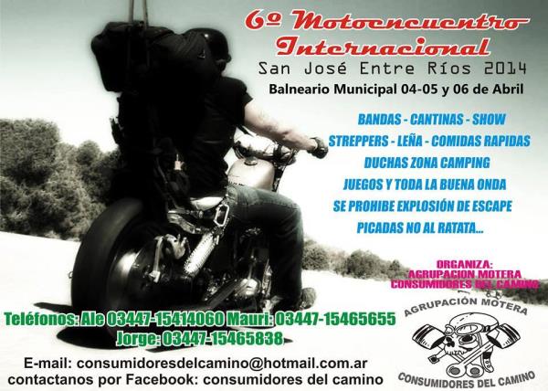 6 motoencuentro en san jose entre rios, tendremos bandas en vivo, caravana por la ciudad, entrega de premios y menciones, cantinas, baos y duchas y el camping con parrilla y todas las instalaciones aptas para acampar.