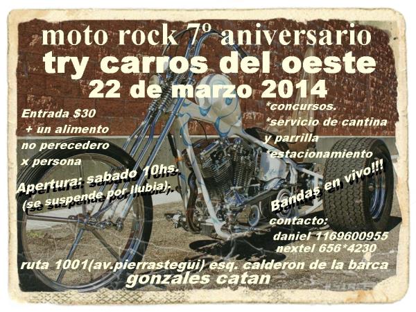 amigos este ao no vamos hacer el encuentro por problemas ajenos.pero vamos a hacer un moto rock a beneficio de la fundacin que tuvo la mala suerte de que se le prendiera fuego la casa con todas sus pertenencias y para colaborar y festejar nuestro 7 aniversario decidimos organizar este moto rock, para colaborar y asi poder ayudar a que vuelva a empezar de apoco con nuestra ayuda y la de todos ustedes como siempre lo hacen cada ao desde ya muchas gracias.daniel de try carros del oeste.gracias y que sea rock!!