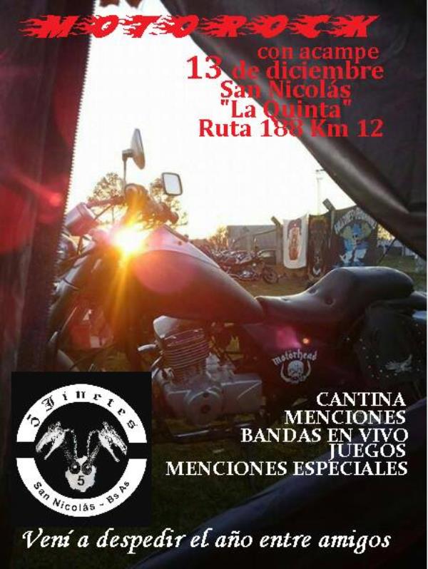 motorock con acampe, cantina, menciones, juegos, menciones especiales ven a pasar un da de amigos,motos y rock, bandas en vivo: crneo candente- m82- macadam-medieval-paranoid y otras que iremos publicando.ven a despedir el ao entre amigo