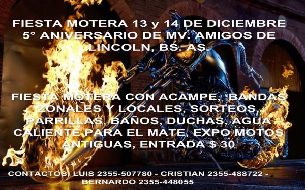 fiesta motera con acampe 13 y 14 de diciembre, bandas gitana, viejo belisario, hierro del ocho, leyenda negra, jornal y muchas ms. sorteos, parrillas, baos, duchas, agua caliente para el mate, expo motos antiguas, entrada $ 30