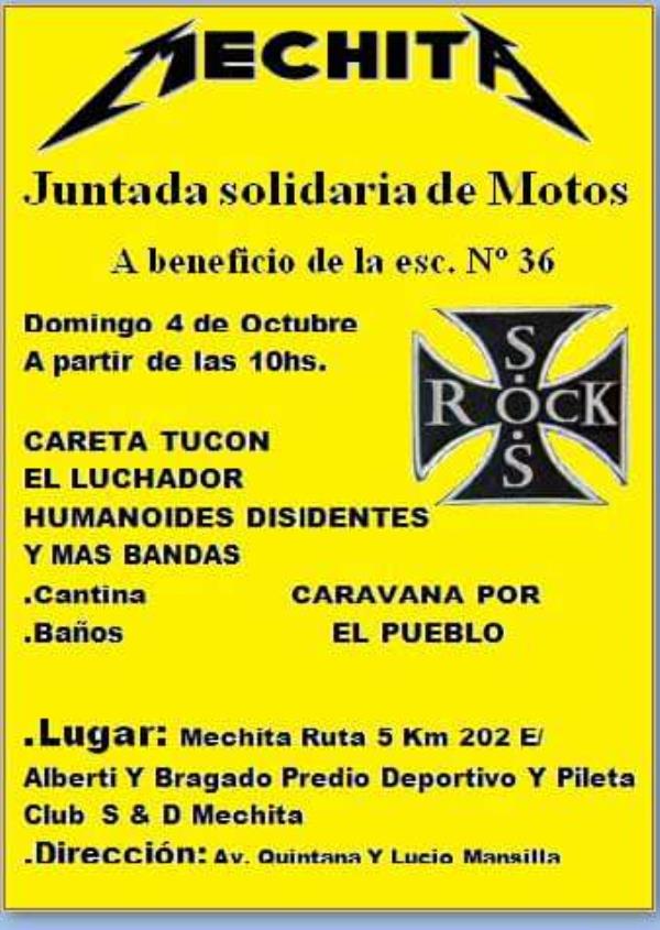 hola amigos moteros los estamos invitando a una juntada de motos solidaria a realizarse en mechita, entrada libre y gratuita, bandas de rock en vivo, baños, cantina a beneficio de la escuelita nº36, caravana por el pueblo.