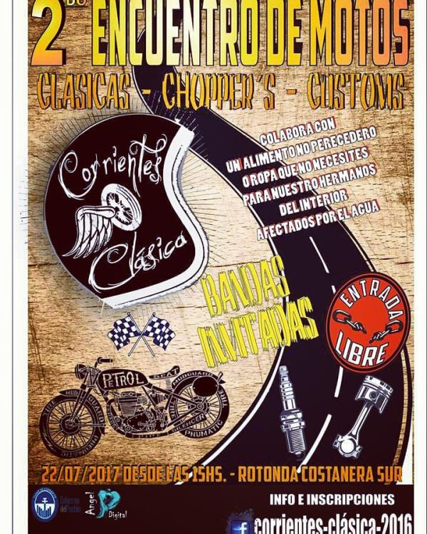 corrienes clasica es un encuentro solidario de motos clsicas, choppers y customs (desde 125cc.), bandas de rock invitadas, mucha amistad y camaradera, inicia a las 15hs, entrada libre slo colabora el que puede con algn alimento no perecedero o ropa que ya no utilice para nuestros hermanos menos afortunados afectados por la inundacin.