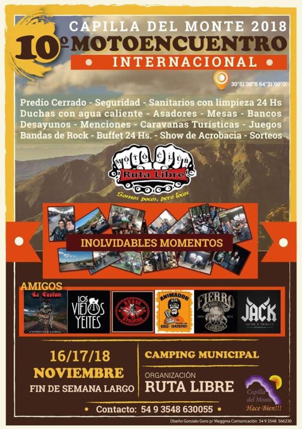 este ao con especial convocatoria a la mujer motera.una reunin de amigos, un evento como los de antes, solo amistad y camaradera, todo enmarcado dentro de paisajes de ensueo.bandas, juegos, paseos tursticos guiados, seguridad, stand, sombra, ro, pileta, mesas, bancos, toma de 220v para las parcelas de acampe, carpa gigante, bufet, sorteos, menciones, show acrobtico, una de las dos carpas gigantes ambientada para una fiesta retro despus de las bandas,que te lo comenten, vivilo!!