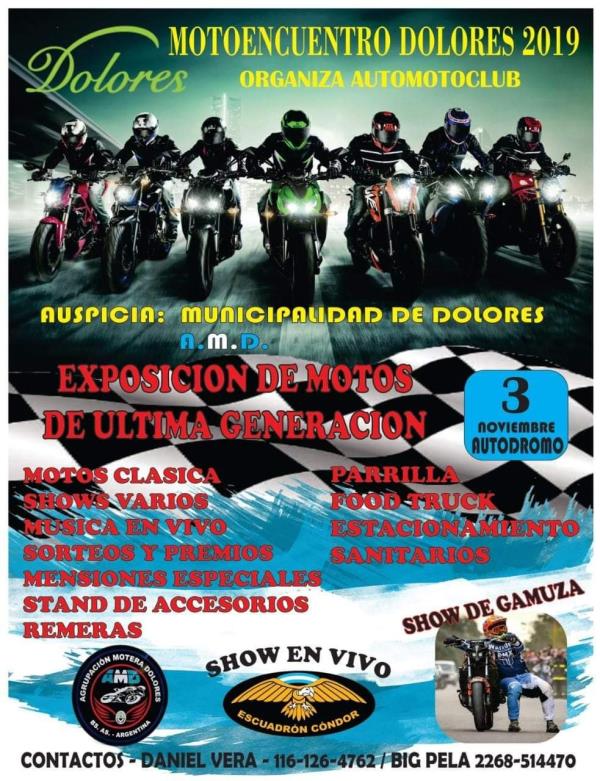 motoencuentro organizado por la agrupacin motera dolores, con el apoyo de la municipalidad de dolores.bandas en vivo, show escuadrn cndor y gamuza benaglia, stands, food truck, sanitarios,m parrillas, etc.