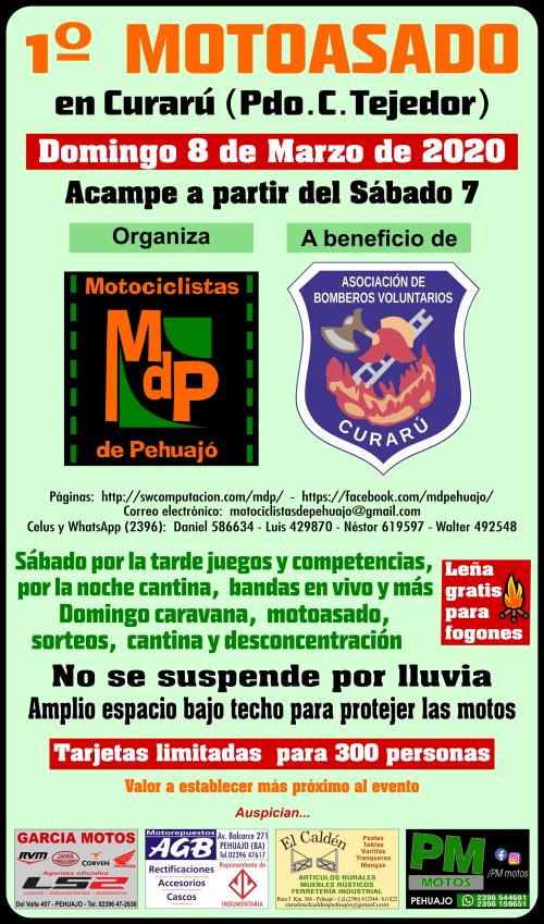 El Sbado ya se puede acampar, habr juegos, luego bandas, cantina y sigue la fiesta. Se proveer lea gratis para los fogones. El Domingo (tambin habr cantina) se realiza el motoasado, se entregarn las calcos a cada asistente, habr sorteos varios, luego caravana encabezada por bomberos por el pueblo y posteriormente la desconcentracin. No se ...